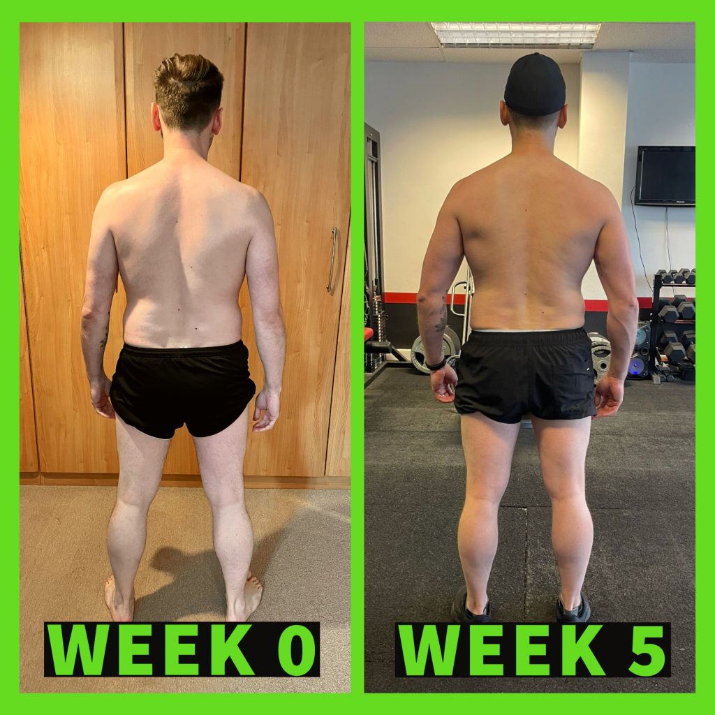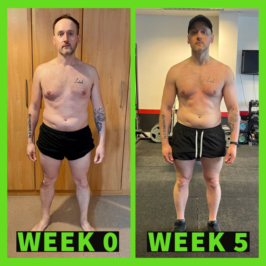 So, words…lots of words, but I suppose none of it means anything without pictures, so as embarrassing as these are (I’m genuinely mortified), here are my latest progress shots – the end of week 5.  I’m really pleased with the early progress, as I can see muscle building in my upper body, some fat dropping off and I’m starting to look like I lift more than a 4 finger KitKat each day! All in just 5 weeks, but, you be the judge.